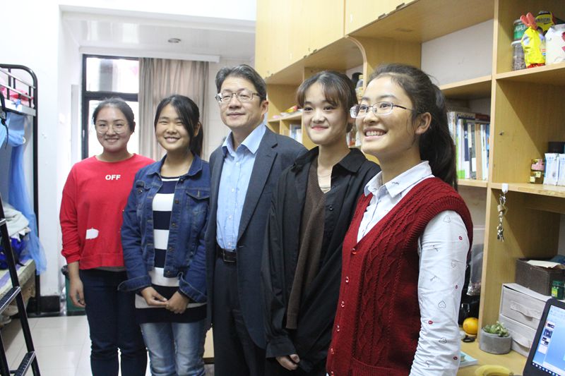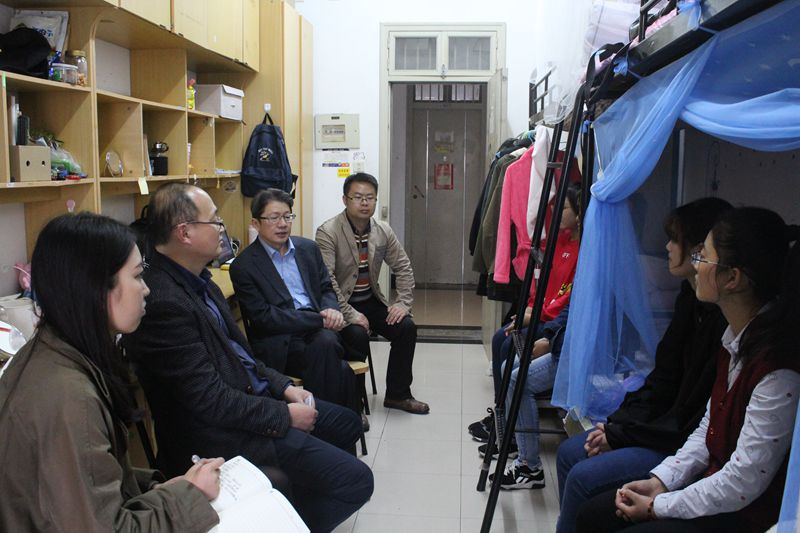 11月7日下午3点,校党委副书记李军在酒店偷拍 党委书记周宏力、学生工作办公室主任兰大伟、团委书记杨月燕等老师的陪同下走访17级本科新生38幢621寝室。