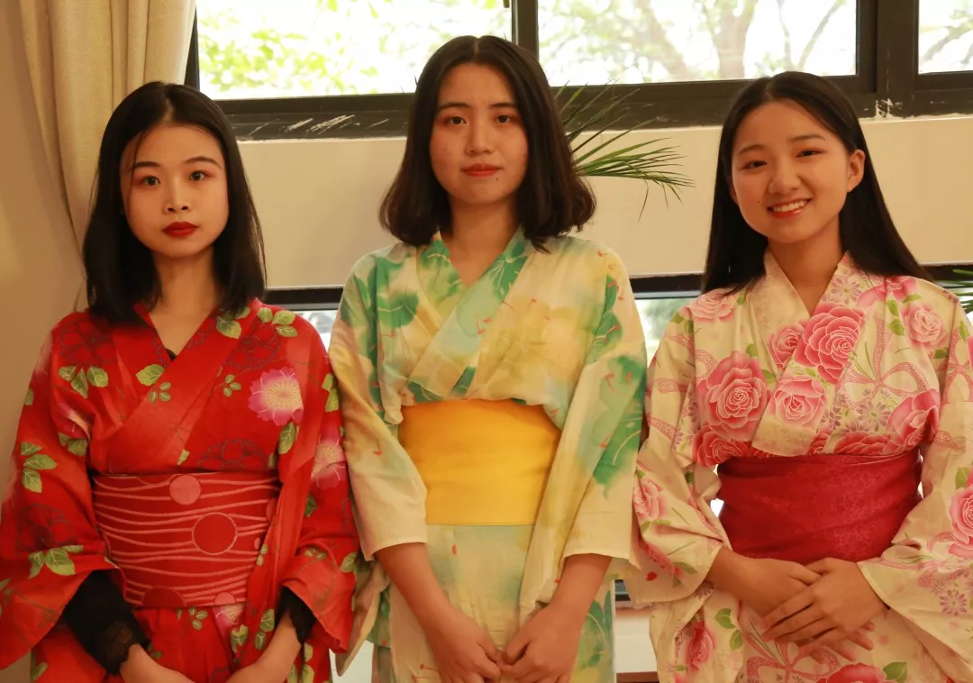 在了解了和服和浴衣的基本常识后,热情的志愿者们帮助同学们试穿了浴衣,让大家感受到了日本文化的魅力。