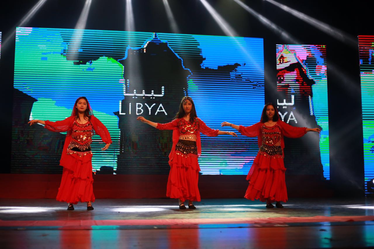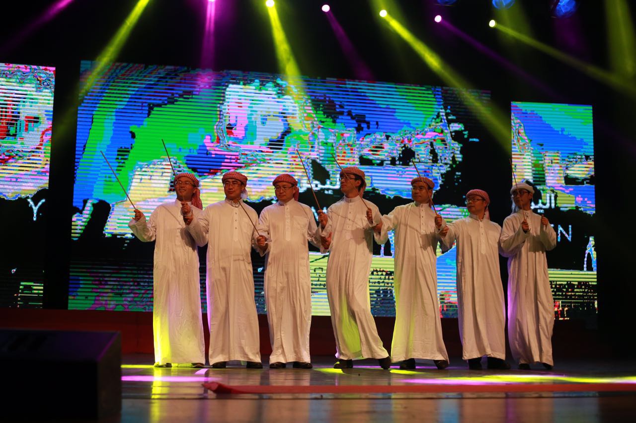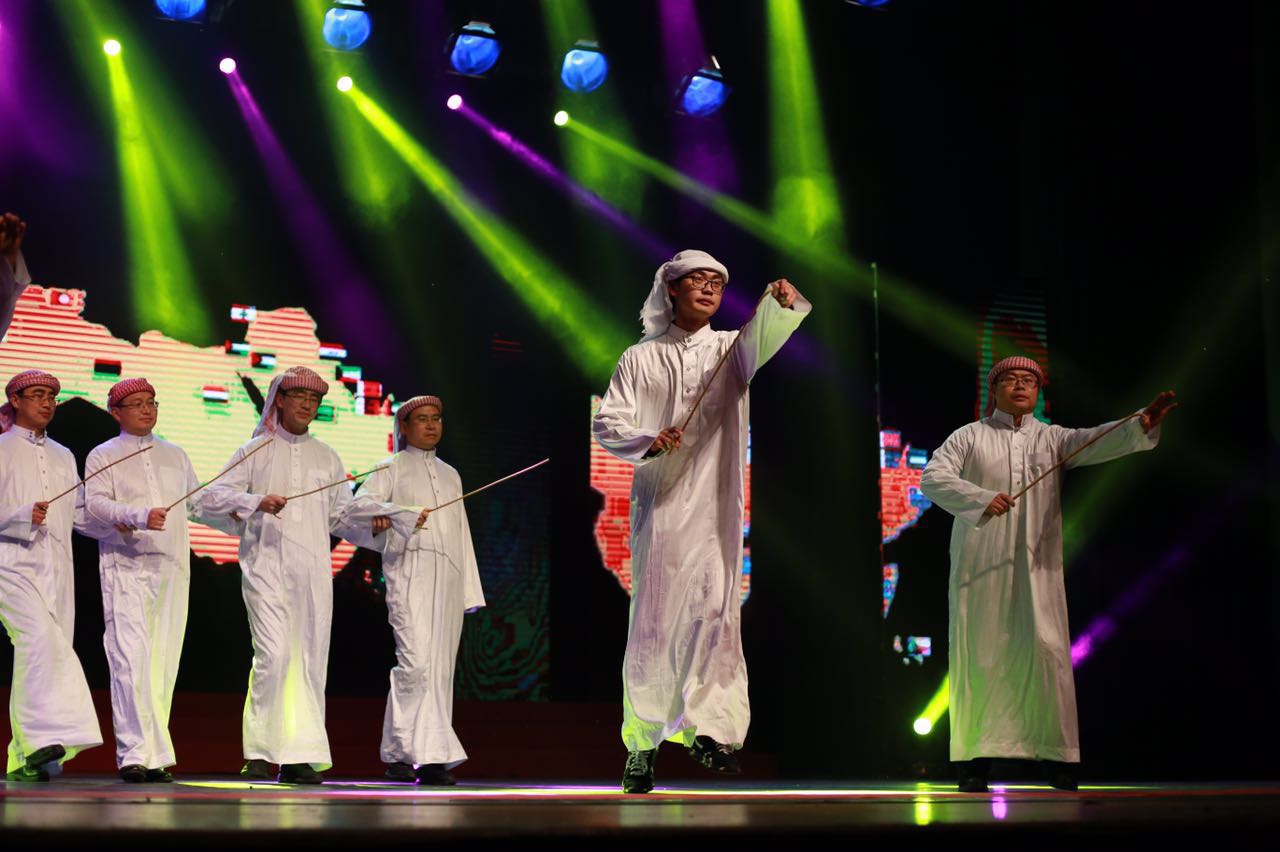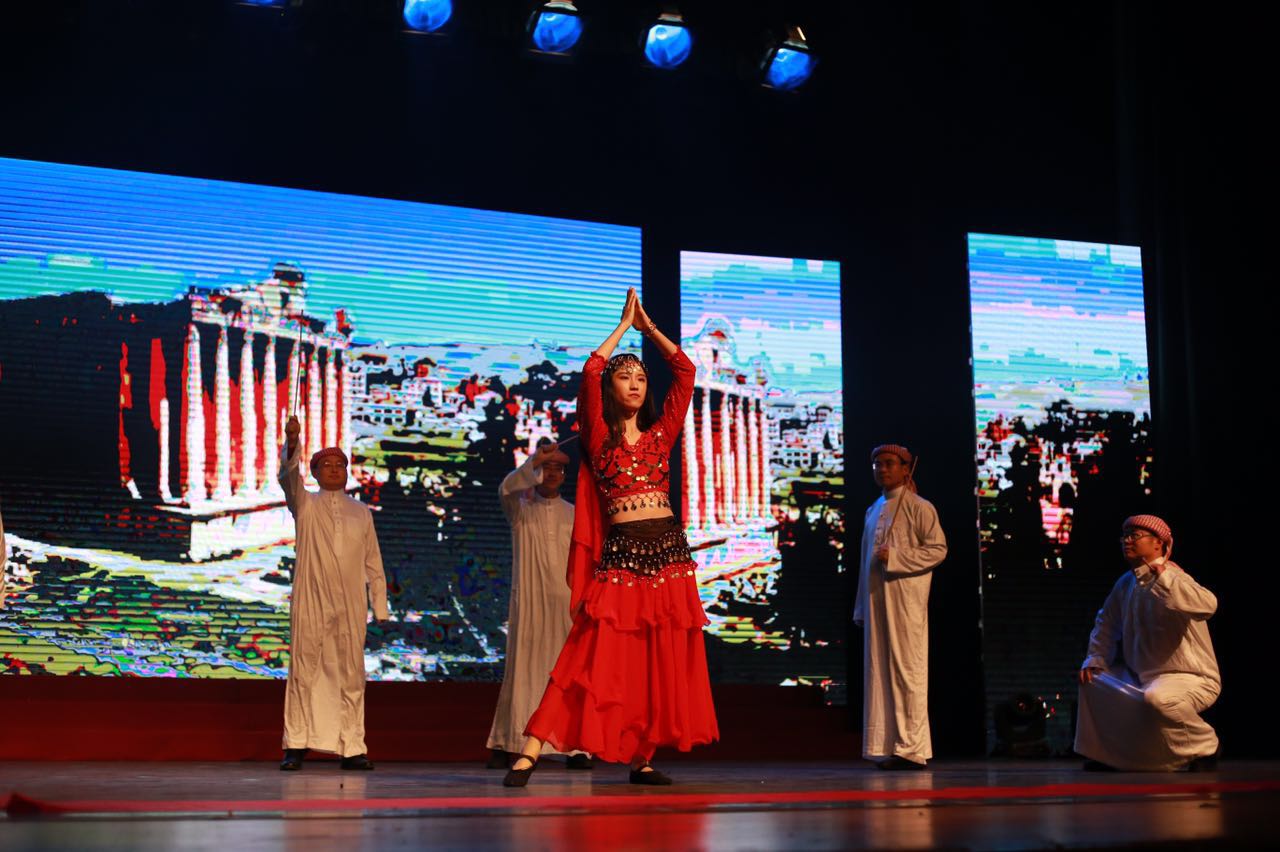 晚会上,《东方神韵》节目一开始,三位阿拉伯语言文化系女教师就以唯美动人的歌声演唱阿语歌曲,优美动人的嗓音围绕着传统阿拉伯乐器的柔美乐曲让人陶醉;接下来,七位男演员颇显英雄气概的阿拉伯剑舞开始登场,白袍、红色头巾加上手上挥舞的类似剑的道具,让人领略到阿拉伯男子健壮的身姿和迷人魅力;最后,身穿红衣的三位女生舞起了神秘性感的肚皮舞,阿拉伯异域风情为观众们带来一段别样的视听感受。据悉,为了参演本次晚会,师生演员们花了近一个月的业余和课余时间进行排练,他们不畏艰难、团结协作、齐心协力,充分体现了爱院荣院的强烈的集体主义观念,在全校舞台上展现出东语人的乐观、向上、积极的精神风貌(参演的教师为:党委书记周宏力、学生工作办公室主任兰大伟、研究生秘书谢咏、日本语言文化系教师徐磊、张晓东、东亚研究院教师聂友军,阿语系教师姬鲁冰、梁盼盼、申十蕾;学生为阿语1701班杨鹏辉、阿语1801班杨艺婕、龚希、邹凯丽,幕后工作人员为阿语1701班徐笑、金展鹏等学生)。