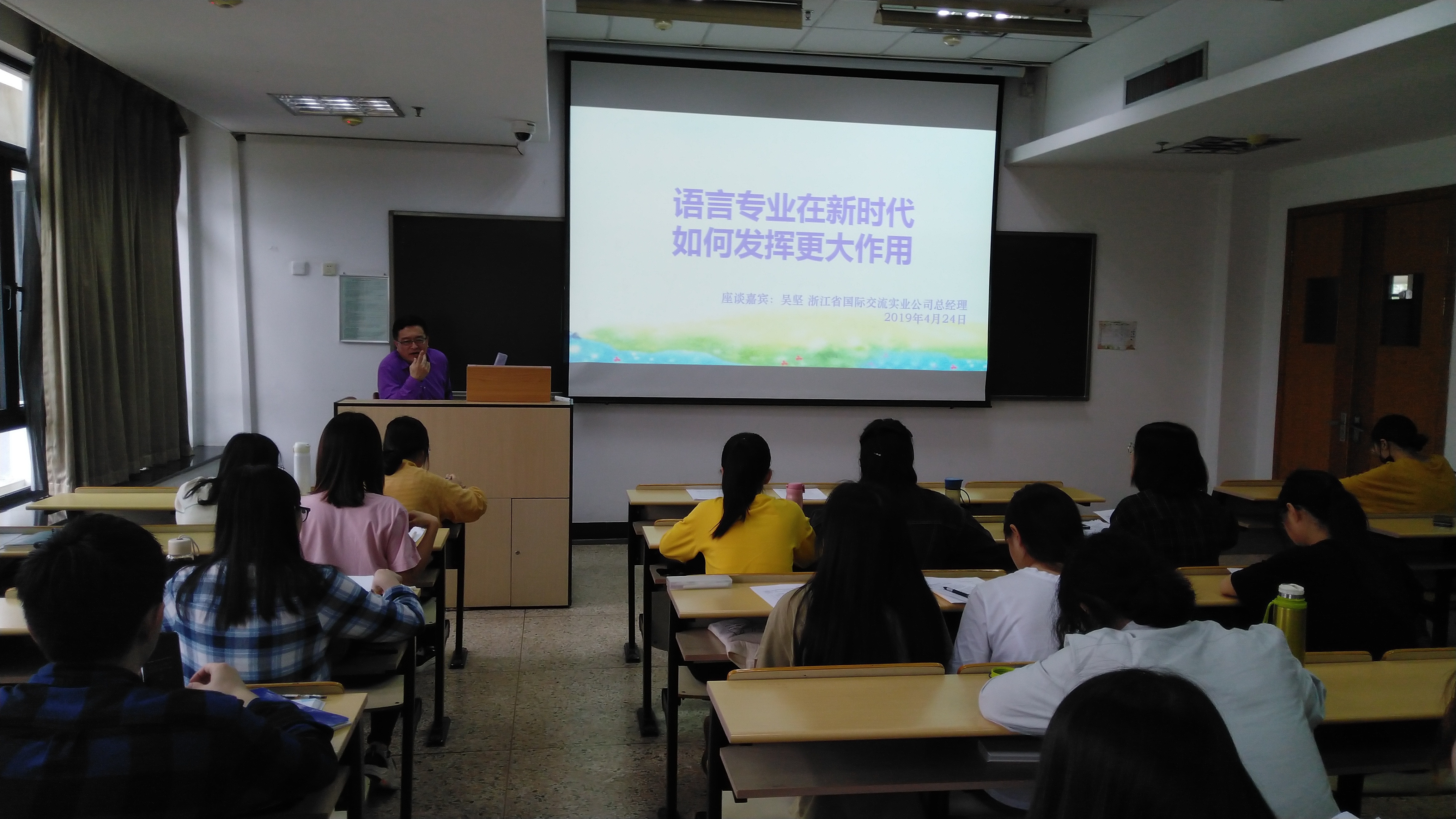 4月24日,浙江省国际交流实业公司吴坚总经理在教学楼A413与酒店偷拍 日语16011602班级同学开展了一次主题为“语言专业在新时代如何发挥更大作用”的实务导师座谈会。酒店偷拍 张晓东老师参与了本次座谈会。