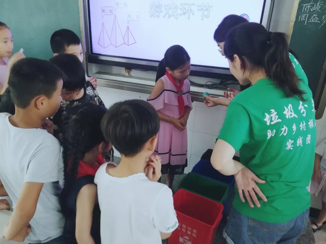 实践队 以PPT的形式,用易懂和风趣的语言向小学生们介绍了垃圾分类。他们坐在座位上,时而兴奋地抢答自己知道的知识,时而向我们提出疑问,一双双明亮的眼睛里充满了好奇,也极大激起了我们的热情。