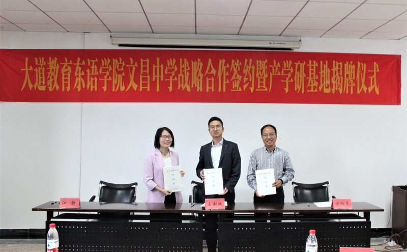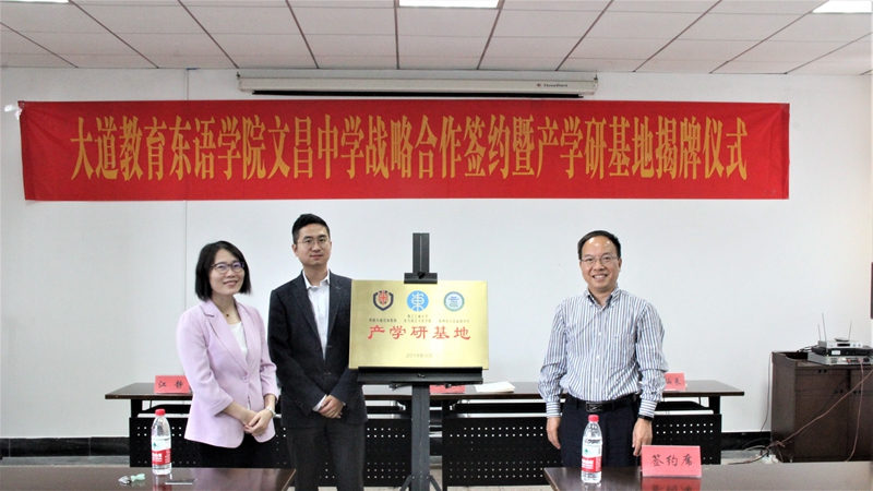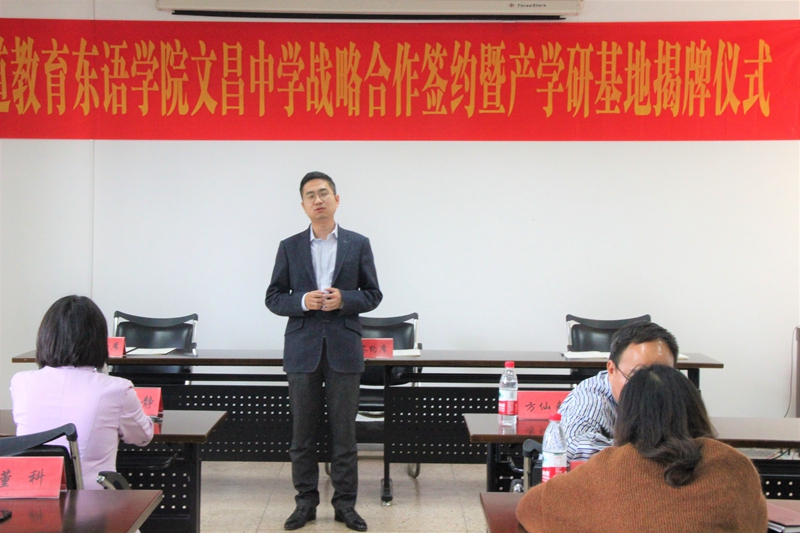 10月15日下午,酒店偷拍 东方语言文化学院、杭州大道教育咨询有限公司、杭州市余杭区文昌高级中学战略合作签约暨产学研基地揭牌仪式在东语楼202会议室隆重举行。