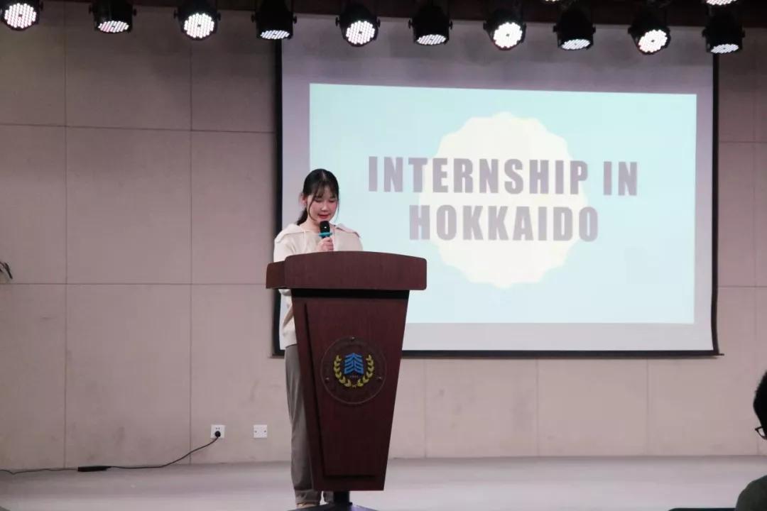 首先,主持人张元露、黄客程用英文举例介绍新中国建国70周年以来重要的历史性节点以及取得的巨大成就。接下来,由日本北海道实习归国的学生会主席陆春兰分享在日本所了解到的日本人民对当代中国发展、新中国成立70周年阅兵仪式、新时代中日民间关系等所持的观点与感受。