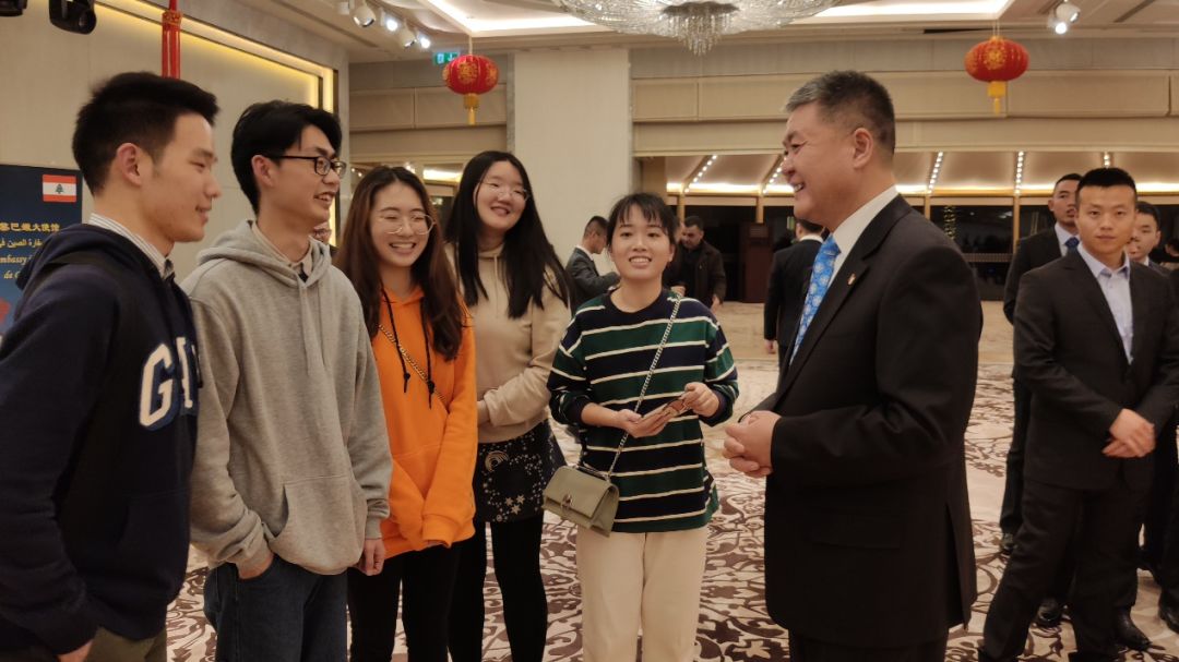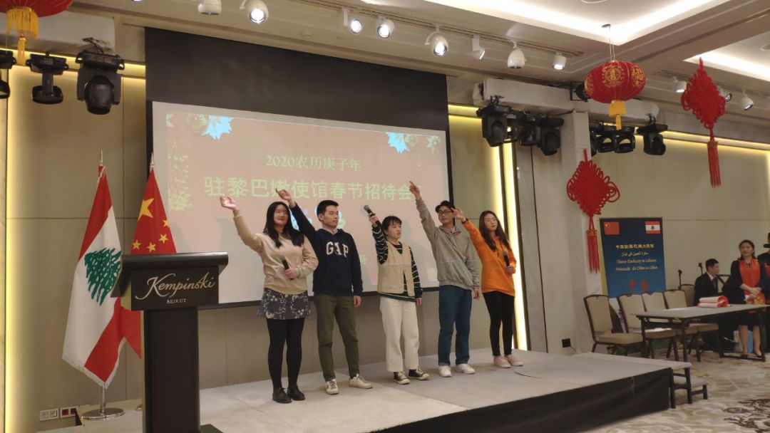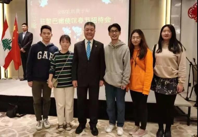 1月21日,我国驻黎巴嫩大使馆举行2020年春节招待会,在黎中资机构代表及教师、留学生、维和官兵、华侨华人和家属等约300人欢聚一堂,共贺新春。我阿拉伯语言文化系在黎巴嫩大学留学的五位学生受邀参加此次招待会,他们分别是阿语1701班王紫珊、周萱、林海雪、杨鹏辉、金展鹏。