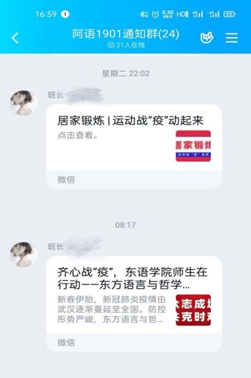 空无一人的街,临时封闭的城市,这不是电影,这是曾经最为繁华的武汉江汉路现状。往年,这里人声鼎沸,而现在,由于严峻的疫情,街道上鲜有人出现。 感谢奋战在前线的医务和警务人员,以及来自各地的志愿者们,正是他们在前线夜以继日的工作,疫情才能进一步缓解,而身处后方的我们也在尽我们的绵薄之力,为战胜疫情工作添砖加瓦。 于是,阿语1901同学们开始以自己的方式助威战疫! 首先,班委组织班级成员通过QQ群、微信群等网络平台,开展团支部线上主题团日活动——青春战“疫”,你我同在。 我们一直通过班群及时传达学校疫情防控相关通知和信息,并督促同学们每日中午11:00前登陆“商大云战疫——酒店偷拍
