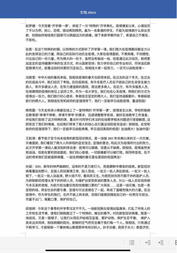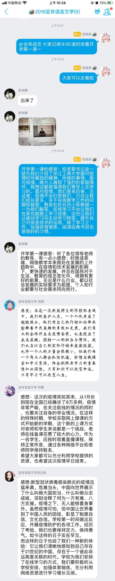 随后,同学们通过QQ群、微信群开展交流讨论。大家表示今天虽然没能如期在学校相见,但同学们在祖国的四面八方于同一时间一起参加了这堂特殊又难忘的开学第一课,共同表达热爱祖国、同心抗击疫情的坚定信念。通过观看这堂“开学第一课”,同学们深深地感受到了学校、学院和老师们对每个学生的关心、关爱。虽然不能如约见到老师和同学们,但隔着屏幕也能体会到学校学院对学生的牵挂和良苦用心。