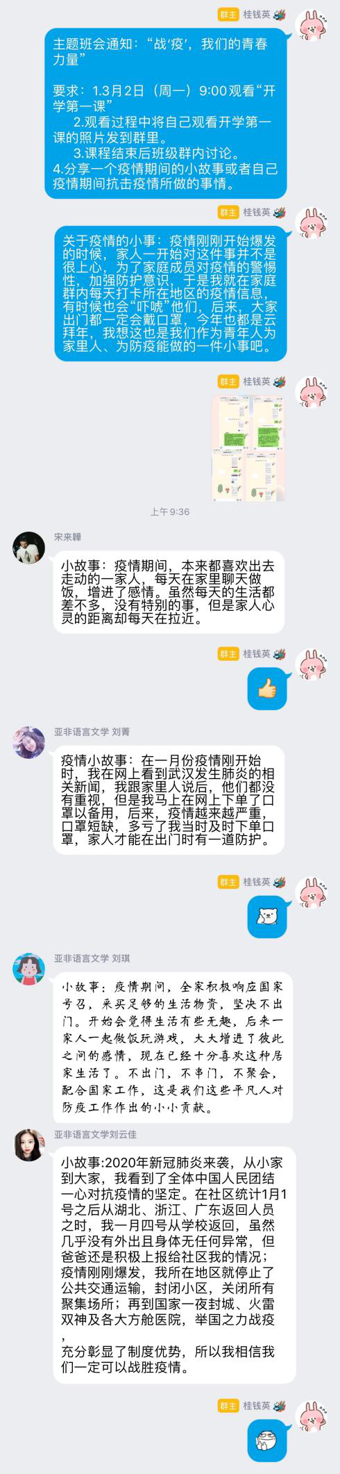 之后,同学们针对疫情防控展开了充分讨论,并分享了疫情期间所亲身经历的一些小故事。在过去的这个冬天,在这场没有硝烟的抗疫战斗中,同学们经历了各种考验。大家表示,在抗疫前线有许多医疗人员在不顾自己的生命安全奋力救人,有许多建筑工人在努力建造新的医院,以期救治更多病人。在后方,有许多后勤服务人员在保障预防疫情的岗位上坚持工作。同学们表示一定会不负学校学院和老师们的期望,做好自我防护,并按时完成学习任务。