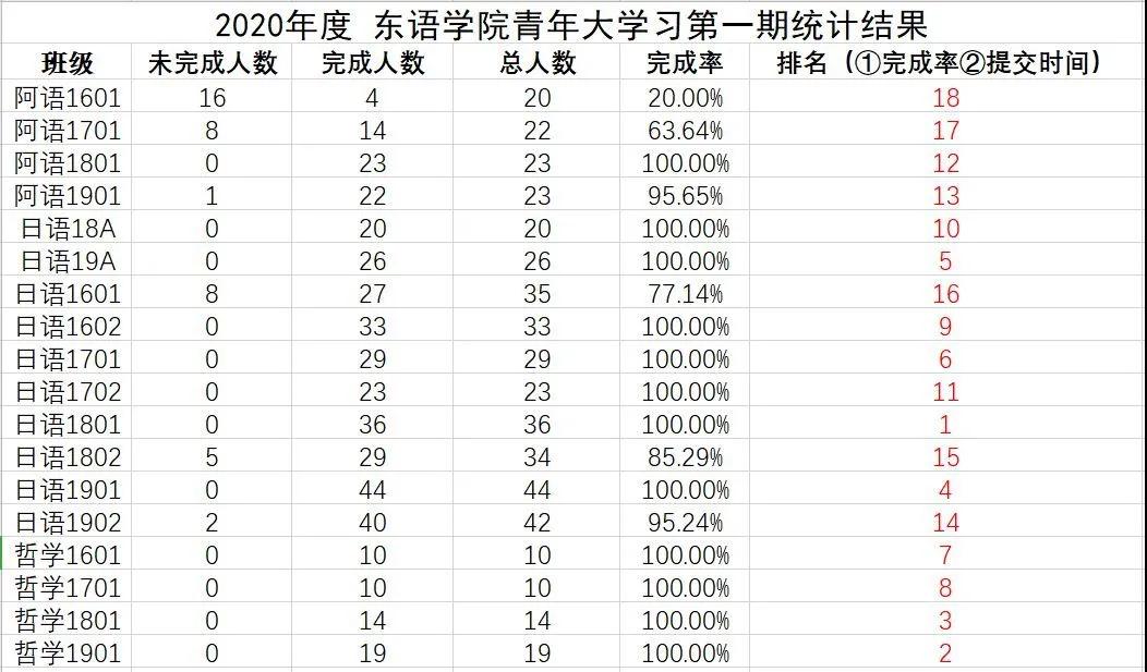 “抗疫战+,从我做起大学习”活动也正在进行中,让我们一起来看看2020年度东语学院青年大学习第一期各班学习统计结果吧!