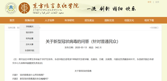 除了正常的教与学课程任务外,学院师生还利用语言特长,开展针对目前新冠疫情的信息翻译工作,如由东亚研究院日本研究中心久保辉幸副教授负责组织监译,东语学院日语笔译19级研究生程学颐、石丽琼、方媛、沈晓雪、冯银花将日本厚生劳动省于3月7日发布的《关于新型冠状病毒的问答》翻译成中文,公布学院网站上。另外由学生工作办公室组织的将抗疫工作中广泛运用的国内“健康码”等措施翻译成日文的工作也在紧锣密鼓进行中,为防控疫情贡献自己的绵薄之力。