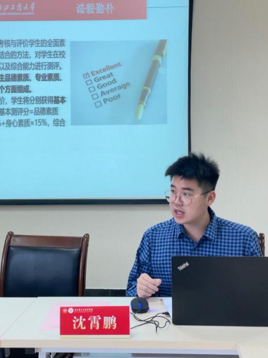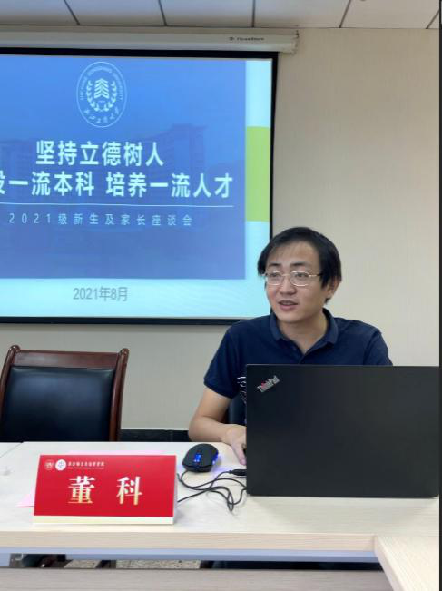 21级本科新生辅导员沈霄鹏老师就新生入学进行了具体指导,他以亲切幽默的语言展示了商大“风景线”、商大“警戒线”、商大“攻略线”等内容,调动了新生对商大生活的好奇心。此外,沈老师就防诈、防疫两项安全工作作了详细说明,并希望能与家长多沟通、多交流、多分享,加强家校联系,互相支持帮助,一起为同学们撑起一片广阔的天地。