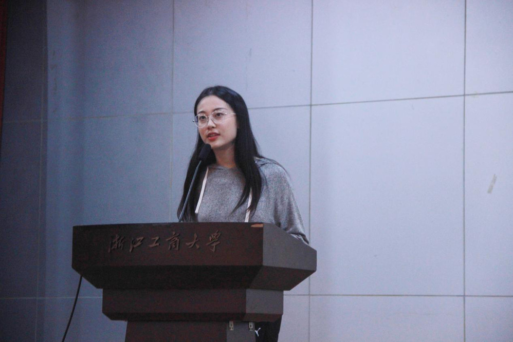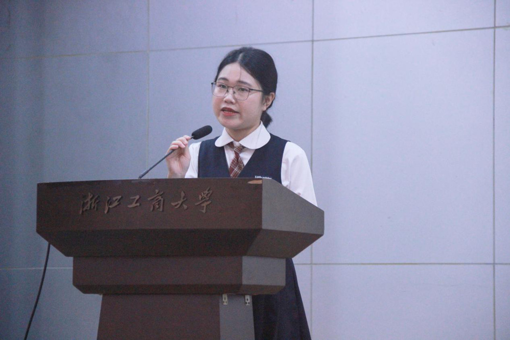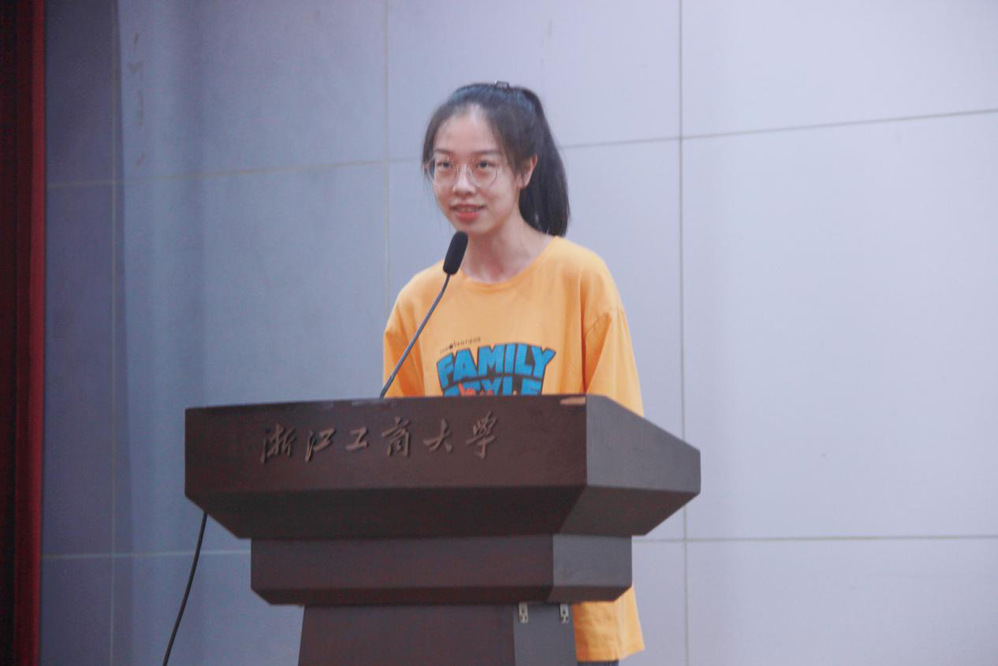 在校生代表、哲学1801班娄嘉萱向新生们献上了自己的祝福,也分享了自己在商大、在东语学院所收获的点点滴滴,并以自身经历为新生拨开迷雾,提供切实可行的学习建议。