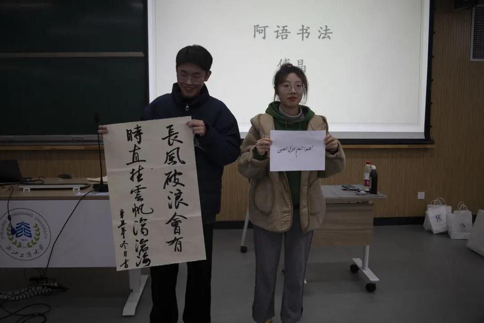 紧接着举行阿语系学生才艺表演。张柯荧同学一曲《金蛇狂舞》的笛子独奏让大家大开眼界;李欣然同学《How Would You Feel》、王静怡同学《كن أنت》、余雯倩同学《حلوة يا بلدي》以及余晟文同学《你曾是少年》的歌曲表演也让大家乐在其中;最后李家旺同学和傅晶同学分别带来汉字和阿语书法表演,更是把中阿文化的交流与碰撞体现得淋漓尽致。