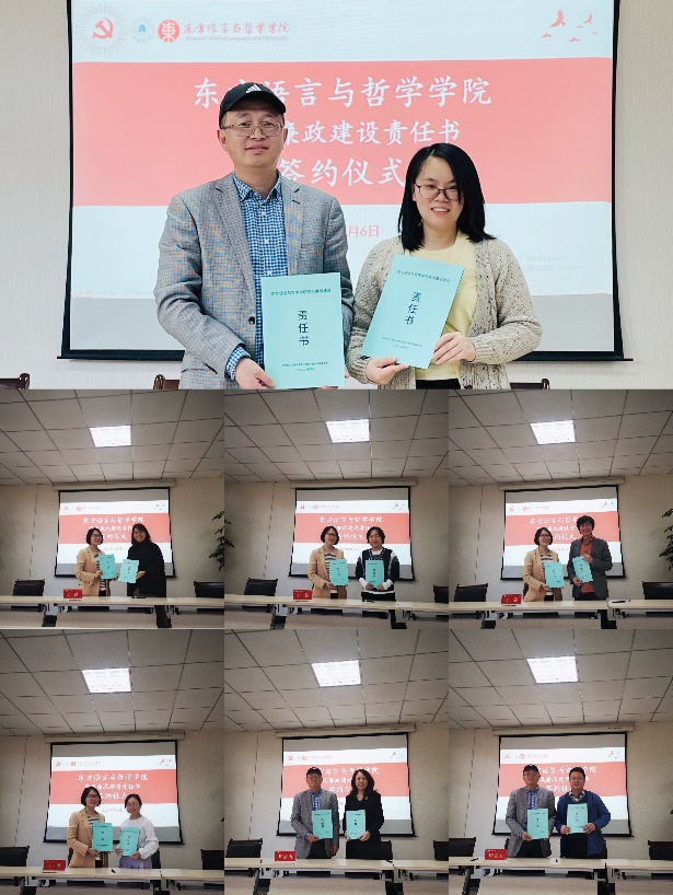 最后,院长江静分别与日语系、阿拉伯语系、哲学系以及院研究生教学部负责人签订责任书,院党委书记周宏力分别与学院办公室、东亚研究院办公室及学生工作办公室负责人签订责任书。