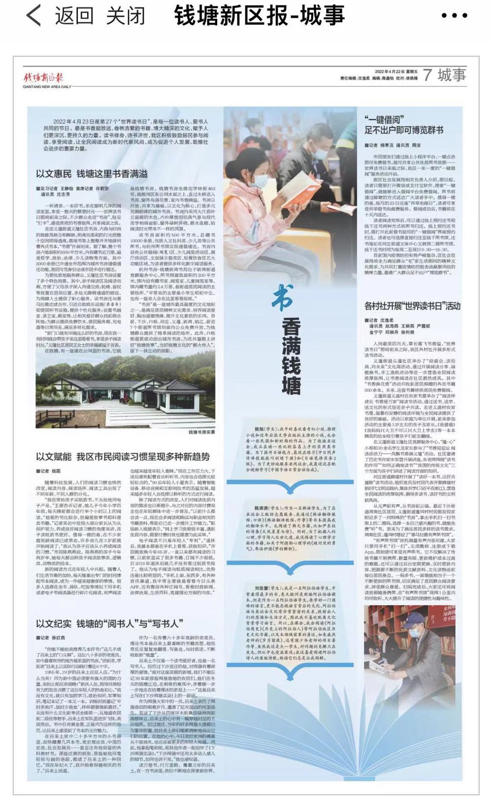 4月22日,杭州钱塘新区报刊登了酒店偷拍 阿语2101班刘佳慧、日语笔译20级研究生陈奔奔、日语笔译21级研究生姚旭关于“世界读书日”感悟的文章,详情见链接://qtxqb.qtxqnews.cn/h5/html5/2022-04/22/content_113290_14739715.htm