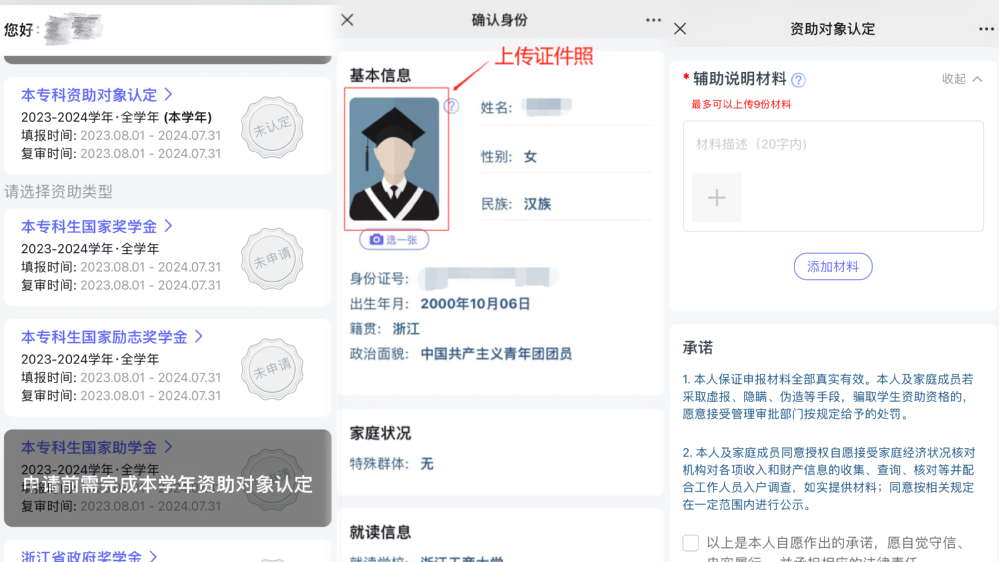 *学生操作流程:选择业务——确认身份(首次操作需上传证件照)——填写必填项、签字提交——完成申请