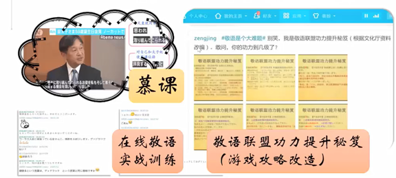 接着,曾老师分享了传统教学模式转变为代学模式的实践经验。从新东方董宇辉的文化漫直播讲起,分析了用讲故事的方式来讲知识、开脑洞,让简单的知识变成复杂有趣的内容,再把有趣的内容变得深刻,实现知识、能力、素质的有机融合和高阶性和高级思维培养的可行性。在带学模式下,教师从教授者转变为终身学习的示范者,学习不再局限在课堂和课本。比如,在教学日语敬语时,先让学生看慕课,然后参考学生平时玩的英雄联盟游戏攻略,将教学内容包装成日语敬语联盟功力提升秘籍,助力学生乐学日语。