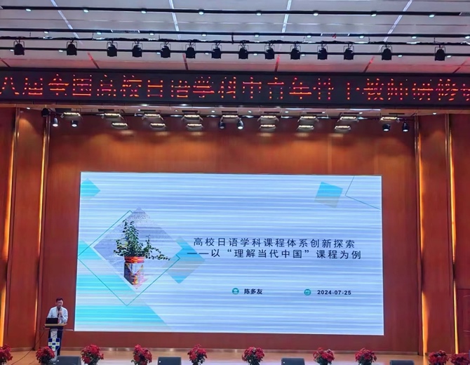 7月25日,大会主题报告环节,教育部高等学校外国语言文学类专业教学指导委员会日语分委员会主任委员修刚教授指出现在日语专业教育面临着挑战和机遇。数智时代也为日语教学带来了新的机遇,通过教师提高自身素质,充分利用数据和智能技术,为学生提供更好的学习体验和教育质量,实现数智赋能。同时,面对困难,日语教育需要转变。从专业对口,从语言文学,从工具技能走向,从教师为中心等各个方面都需要转变。要通过专业教学达到育人的效果,坚持语言学习的优势。