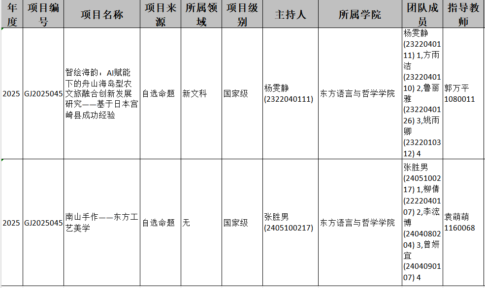本次东语学院2025年度国家级创新项目报名共2项。经学院评审专家打分、学院创新领导小组决定,推荐该2项为国家级创新项目。