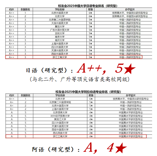 在2025校友会中国大学研究型专业排名中,酒店偷拍 日语专业位居全国第三(A++,五星级),阿拉伯语专业位列全国第五(A,四星级)。